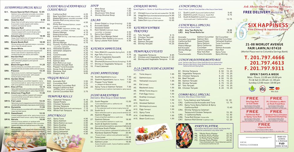 "Six Happiness" is a versatile Japanese-Chinese fusion restaurant located in Fair Lawn, NJ. With a wide range of appetizers ranging from homemade pork dumplings to sushi appetizers like pepper tuna tataki, this restaurant offers a diverse selection to please any palate. The kitchen appetizers such as gyoza and shrimp tempura give a taste of traditional Japanese cuisine, while the BBQ spare ribs and chicken on the sticks showcase Chinese flavors. Along with a full bar, outdoor seating, and a casual ambiance, "Six Happiness" provides a comfortable dining experience for both lunch and dinner. Whether you're craving sushi or classic Chinese dishes, this restaurant is a great choice for a satisfying meal.